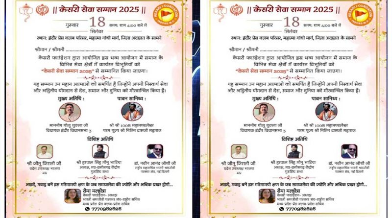 समाज सेवा और राष्ट्र सेवा के विभिन्न क्षेत्रों में उल्लेखनीय योगदान देने वाली 21 प्रतिभाशाली हस्तियों को “केसरी सेवा सम्मान 2025” से अलंकृत किया जाएगा। यह भव्य समारोह 18 सितंबर 2025, शाम 4 बजे इंदौर प्रेस क्लब परिसर में आयोजित होगा।